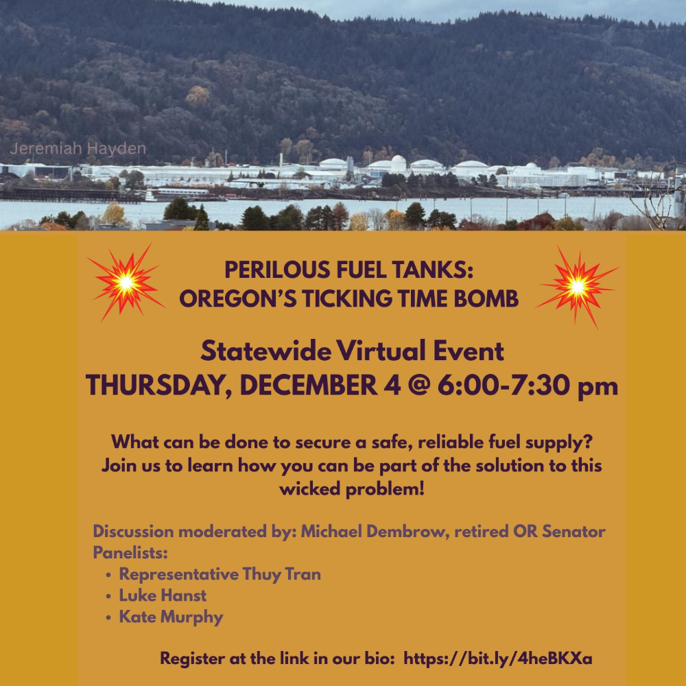 Sponsored by: Consolidated Oregon Indivisible Network (COIN); 350PDX; Beyond Toxics; CEI Hub Task Force; Columbia Riverkeeper; Community for Earth, First Unitarian Portland; Linnton Neighborhood Association’s Tank the Tanks; League of Women Voters-OR; MCAT; Oregon Physicians for Social Responsibility; Risk Bond Coalition; Southern Oregon Climate Action Network; Willamette Riverkeeper.
