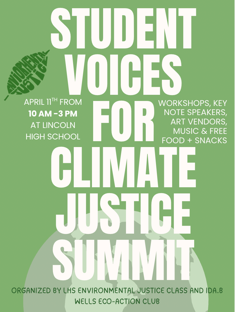 On Saturday, April 11th, Lincoln High School’s Environmental Justice Class and Wells High School’s EcoAction Club will host the Student Voices for Climate Justice Summit with workshops by local organizations and students, an expert panel, live music, a thrift pop-up, art, and free food (Banh mi). If you're interested in taking action, learning to organize, engaging with today's most pressing issues, and building community, please join us! Workshops will be taught on a variety of topics, such as lobbying, giving testimony, local air quality advocacy, the Willamette river and Portland’s fossil fuel hub, data centers, immigration rights, nuclear disarmament, and much more.